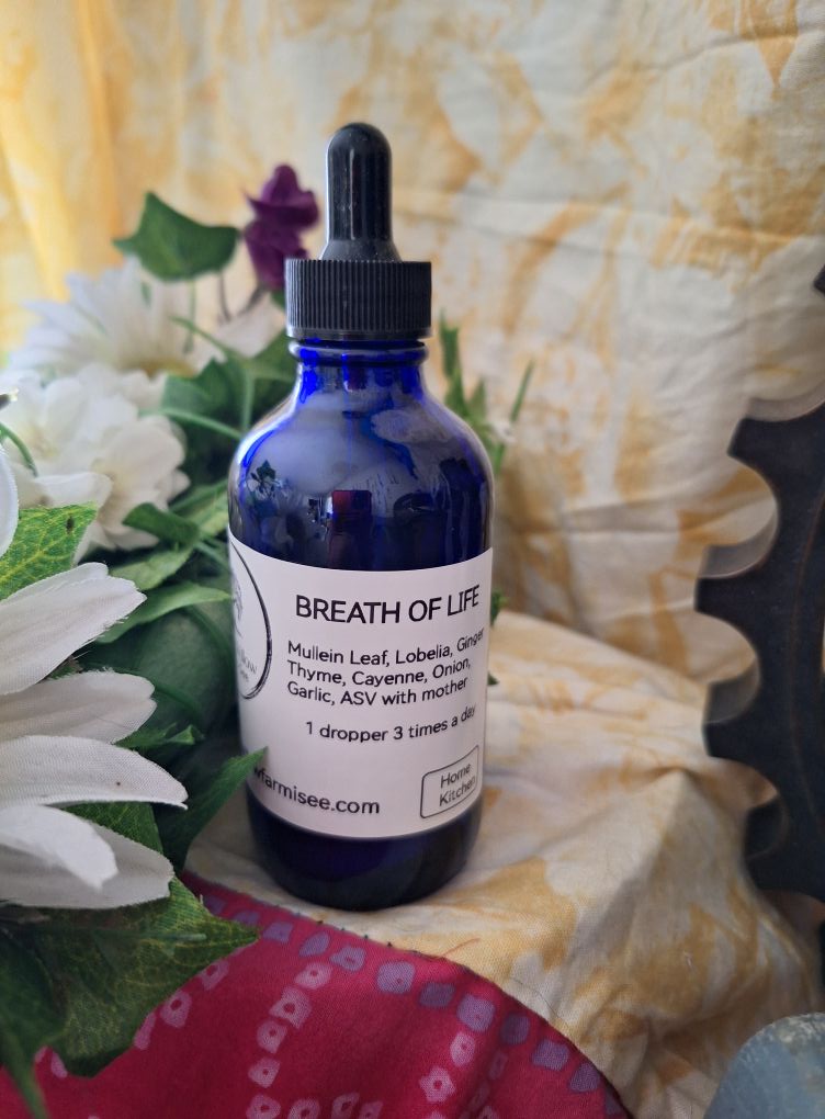 “Breath of Life is a God-given herbal blend with mullein, thyme, lobelia, cayenne, and onion and garlic, ginger, oregano. It’s designed to strengthen the lungs, clear the airways, and help repair damaged tissue over time. Take 1 dropper in water up to twice daily. Not for use during pregnancy or nursing. Always seek wisdom and consult your provider if you’re on medications. Remember — true healing takes time, but God gave us these herbs for a reason.”